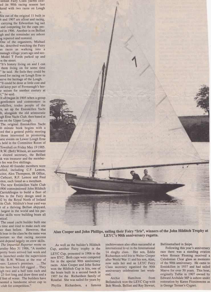 With the reformation of the LEYC in the 1940s, the Enniskillen Yacht Club was in a long period of decline before phasing out of existence by the 1980s. The EYCs assets, sailors and Fairy boats were gradually moved over to the LEYC over a 40 year period as the former became more of a social club. Below is a collection of photographs from the founding of the Fairy fleet at Enniskillen to the late 1990, with the boats in action, with descriptions for further reference and history. These galleries are being updated.