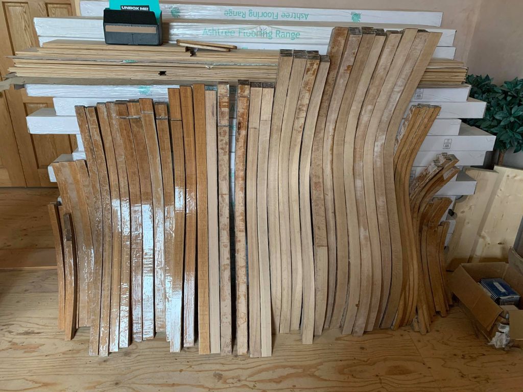 Doreen in a poor state, 10 years since she was last in Lough Erne.24 of the 52 frames needed for both boats.Built in several parts, the ‘Big Knee’ will have further laminates added to it, before finally being shaped to size.The two new ‘Big Knees’ for Paxie & Doreen.My preliminary cutaway revealed our long held suspicions about Doreen’s timber: rot and decay were in every inch of the yacht, from stem to stern. The stern frame had been badly and dangerously repaired at some point in her life. Very fortunate that didn’t breakaway in the last 30 years.Removing the original metal floorsLifting the keelson from the keel.The base of the new Doreen, her original 1906 keel was in very good condition and now awaits sandblasting.Doreen & Paxie’s keels, ready for blasting.
