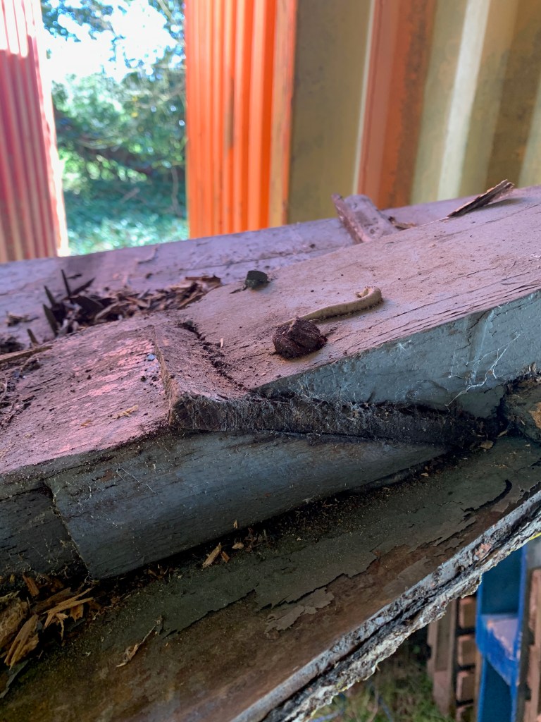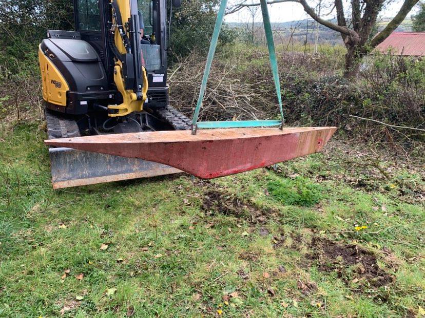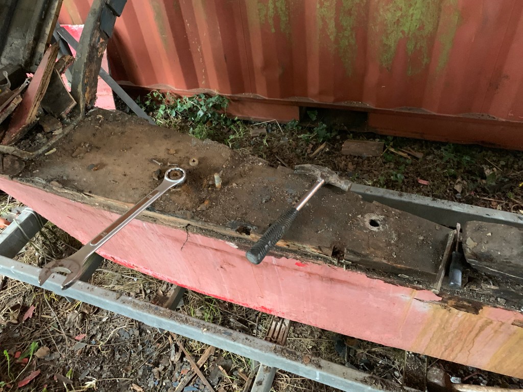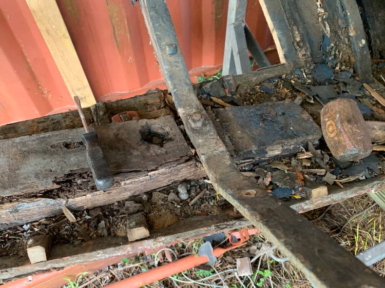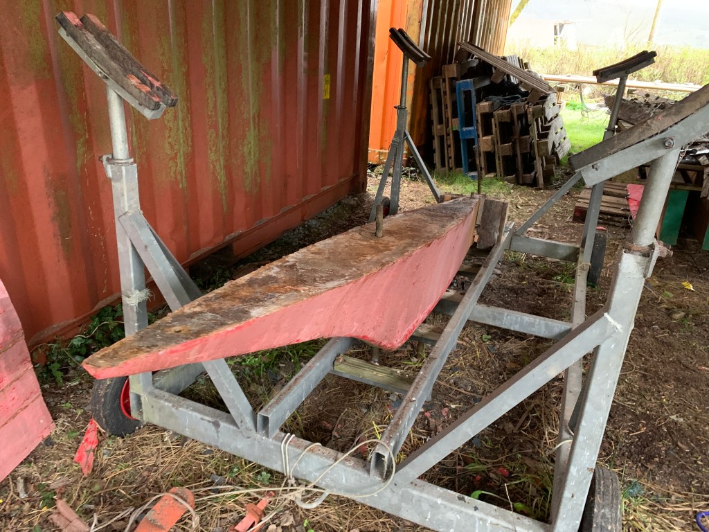 The boat being moved to the new lean-to shed of the Louden-Brown farm.Doreen’s ‘Big Knee’ under construction.52 0f 52 frames for both ‘Doreen’ & ‘Paxie’Installing the keel props to brace the yacht as she is broken up on her launching trailer.The break up of Doreen beginsBow, midships & combing above the waterline removed. Substantial rot and decay had been filled and covered with car filler, a poor repair that let in further moisture.Loosening and cutting the nuts of the keel-bolts.Additional support struts were clamped in place in order to secure the keel to the trolley.The keel is lifted to the trailer.The two keels now epoxy coated, are positioned over their keelsons.