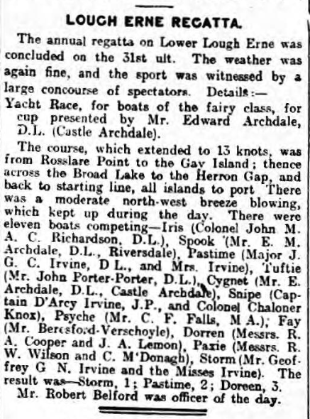Second year of the Fairies sailing, all boats are present, including ‘Fay’ and the rest of the batch 2 boats. Belfast News-Letter, 3 August 1908