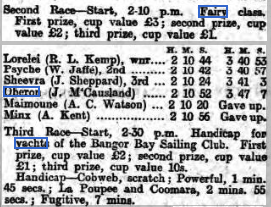 Oberon was the 10th of the RNIYC Fairies built. She was named in honour of William Shakespeare’s character ‘Oberon,’ the King of the Fairies from ‘A Midsummer Night’s Dream.’ She was allocated sail No.11 and sailed from Cultra. Oberon had an active career right until the start of the First World War in 1914. It is believed she was sold to Lough Ree at some point between 1914 and 1919. From here rumour and speculation take place as her final fate remains unknown. Lloyds Register of Yachts, 1919 still has her listed under the ownership of I.E. McCausland, however this is not the most reliable of records given its post-war nature and amalgamation of existing information. We also have to take into account the nature of Ireland at this point, with the beggining of the independence war and the political turmoil that followed. We discovered a yacht by the name of ‘Oberon’ sailing in 1920 at Lough Boffin, which is a relatively short sail up the river Shannon from Lough Ree. By 1941, she was still sailing under the ownership of Vincent S. Delaney, with photographic evidence of a conversion to her hull, encompassing a cabin like configuration. Some stories indicated she was broken up at some point in the 1940s owing to poor condition, others believe she may have sunk at Tarmonbarry in the 1943. Ultimately we have no definite confirmation of her final fate but it is highly unlikely she has survived to the present day. Much like ‘Fay’ (No.12, later 9) at the EYC, the search for her final fate continues.