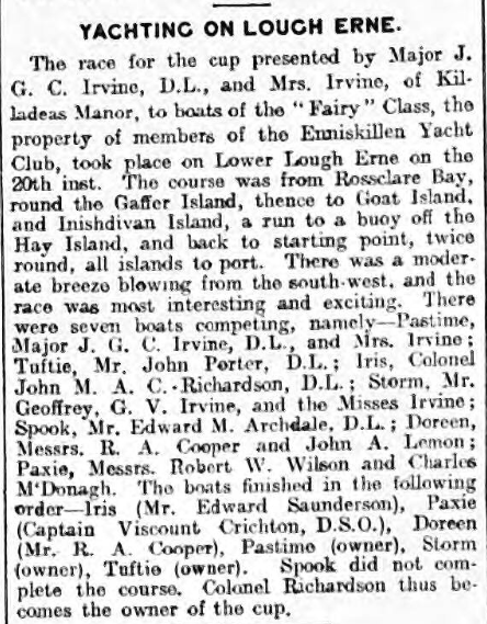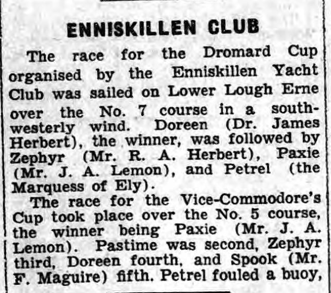 Paxie (No.8) is quite possibly the most distinguished of all the Fairies of the old Enniskillen Yacht Club, having been owned by Robert W. Wilson, one of the founding members of the aforementioned organisation, as well as the key driving force in acquiring the Fairy class for the Lough. Paxie would be one of the most utilised and successful of her class, consistently winning races and almost always answering the gun over the course of the last century, The boat boasted sailors of great repute like Colonel Edward Saunderson; an MP, Landlord and one of the most prominent figures in 19th century Irish Unionism, leading the Irish Unionist Alliance against Home Rule. Saunderson was also a dedicated Yachtsman, having designed, built and owned a number of large one-designs and 2-raters. The most prominent of these being the sinisterly named ‘Witch,’ a 2000 sq ft canvassed Goliath measuring over 40 ft in length that would have made a boat like Paxie look like a dingy in comparison! The name ‘Paxie’ is an odd one as it seems to have no connection to any elemental, mystical or cultural ideas, nor does it seem to be any kind of name in general. It is possible that it could be a play on the name ‘Pixie,’ one of the Fairies of the RNIYC over at Belfast.