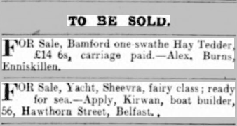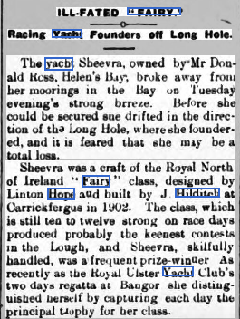 Sheevra was the 3rd Fairy commissioned for the RNIIYC, being a very successful boat during the pre and inter war eras. Despite being the 3rd boat of the fleet, she was given the sail No.4. This was done as the general consensus at the time, was that it was easily confused with the No.8. In August 1925 the boat was declared a total loss, similar to her sister ‘Iolanthe’ after breaking from her mooring and colliding with the shore. She was rebuilt over the falling years before re-joining the fleet at Cultra. This rebuild would make Sheevra the first Fairy to be built by someone other than Hilditch. She converted to Bermudian rig a few years after the rest of the class of RNIYC boats.